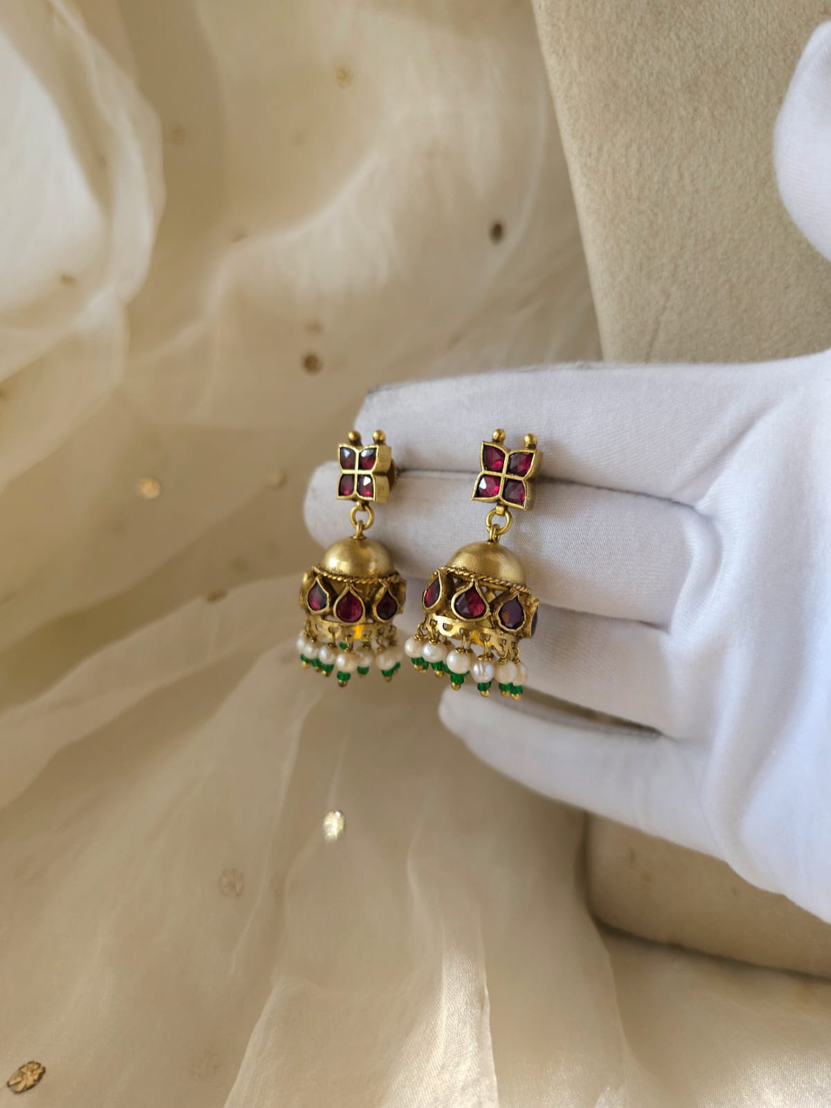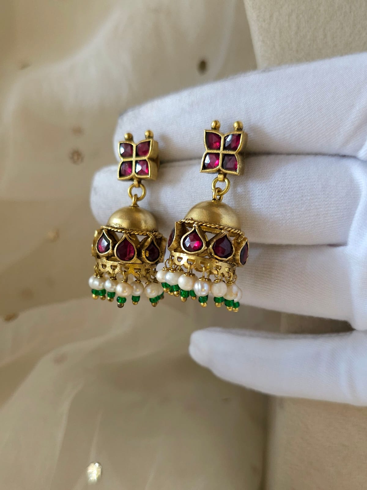 Amber rhodolite gold plated choker necklace set made with silver alloy and studded with rhodolite stones. It is adorned with fresh water pearls. It comes with jhumka earrings that is also adorned with fresh water pearls.