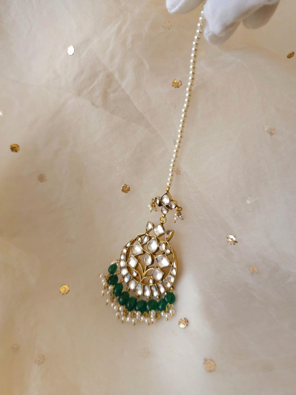 Auspicious pushya gold plated chandtika made with sliver alloy and studded with stone polki. It is adorned with green strawberry beads and faux pearls. Size is 1.5 inches.