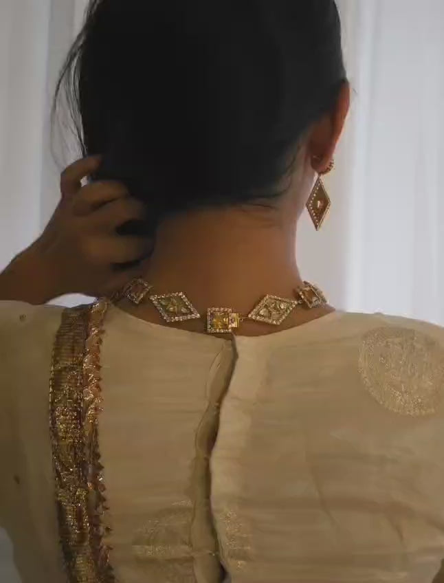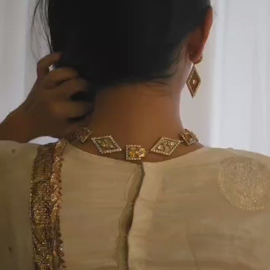 Carlton champagne gold plated earrings made with 92.5 silver and studded with finest quality yellow swarovski stones and moissanite polki along with zirconia diamonds. Length: 2.25 inches. These earrings are the best match with "Carlton champagne silver necklace."