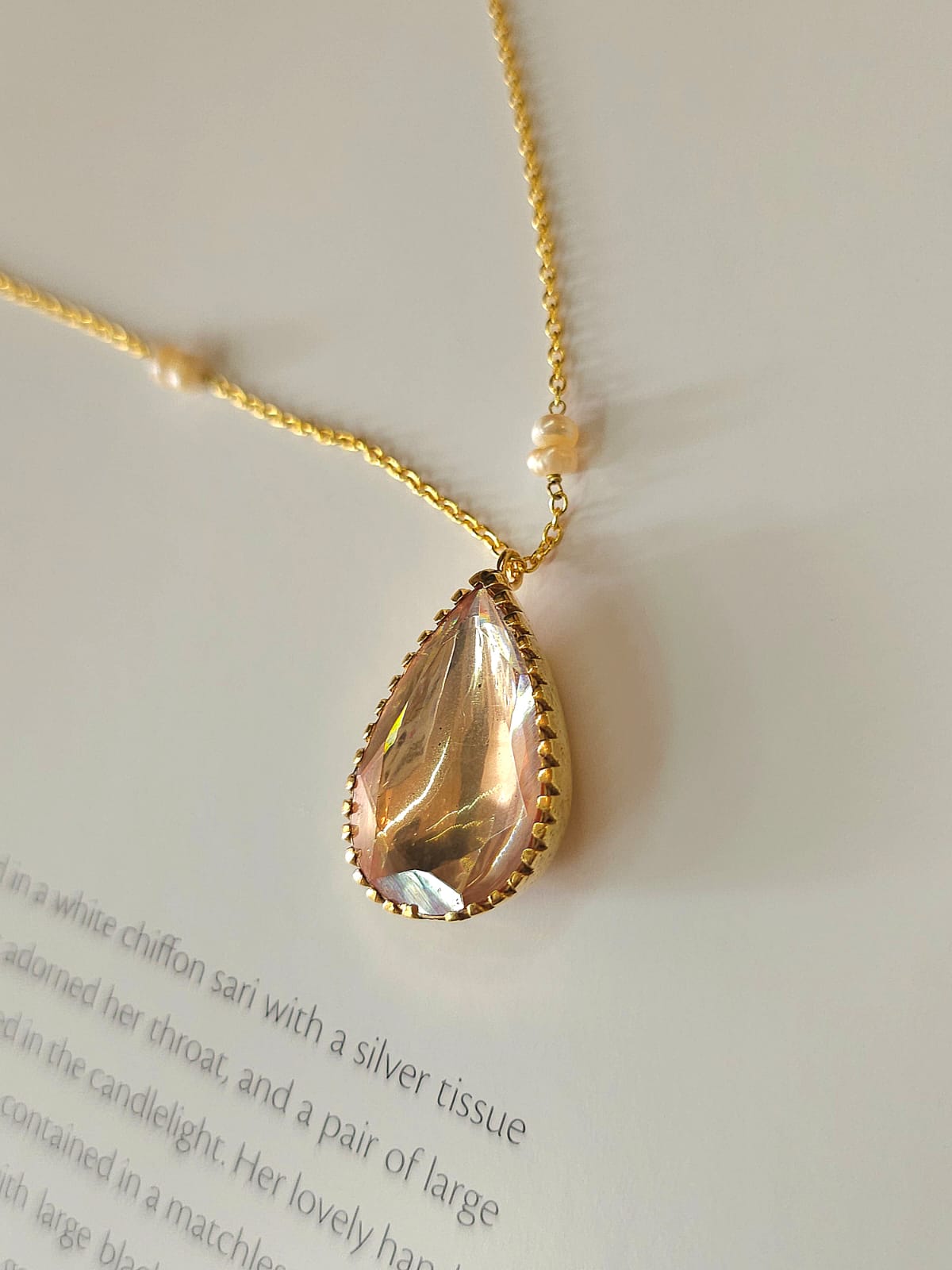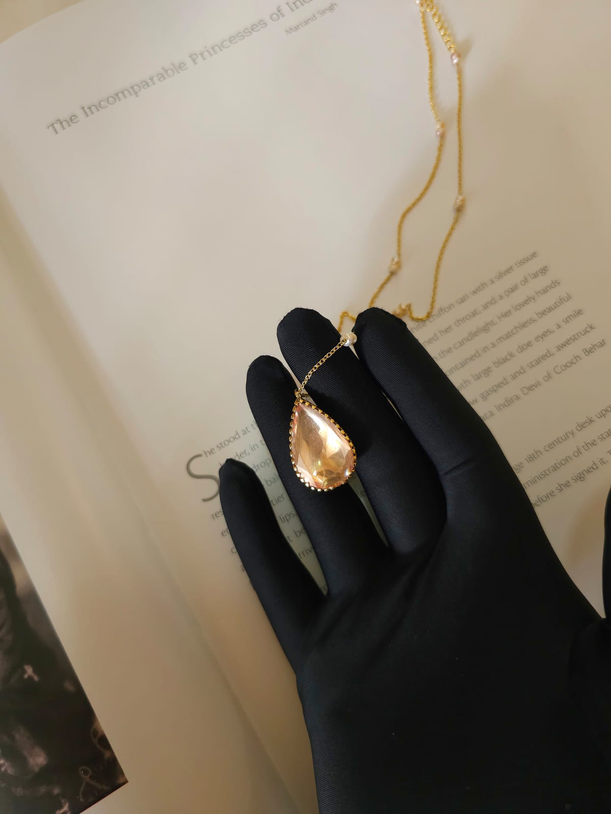 Champagne drop gold plated chain necklace made with 92.5 silver and studded with far size moissanite polki in antique style stone setting. It is adorned with fresh water pearls. Straight length of the necklace: 10.5 inches, chain length: 18 inches.