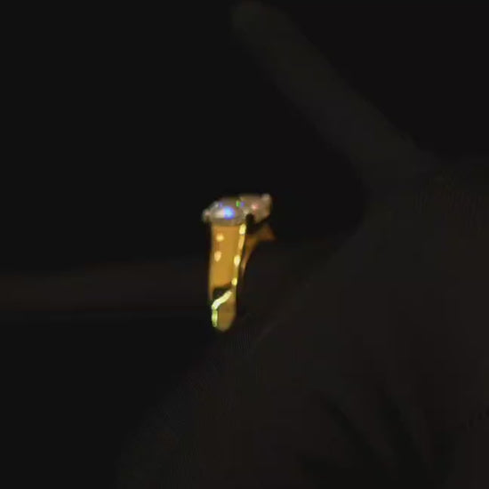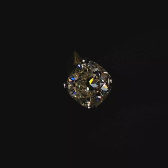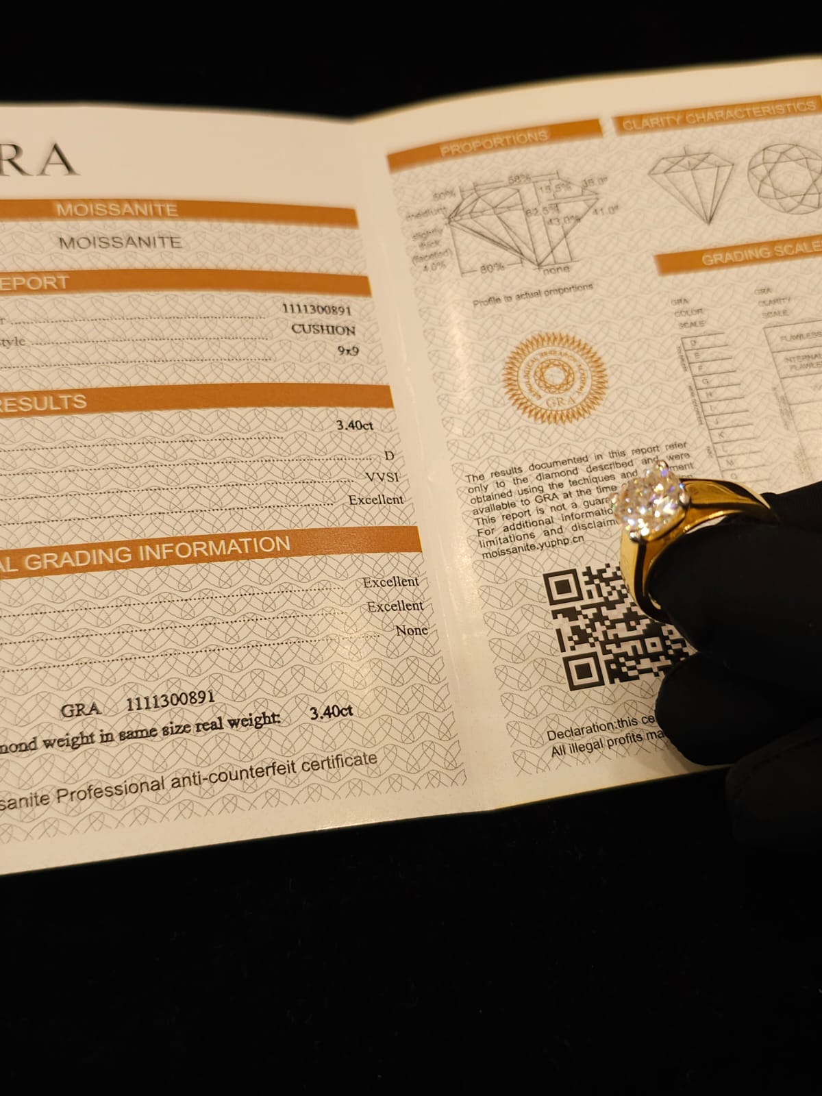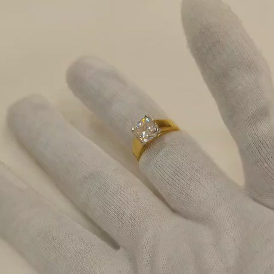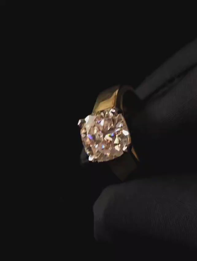 3.40 carat cushion shape Moissanite diamond gold plated ring with 3.40 carat GRA certified moissanite diamond in excellent cut, D color and VVSI clarity. It is made with 92.5 silver and studded with 3.40 carat moissanite diamond. It comes with a GRA certificate.