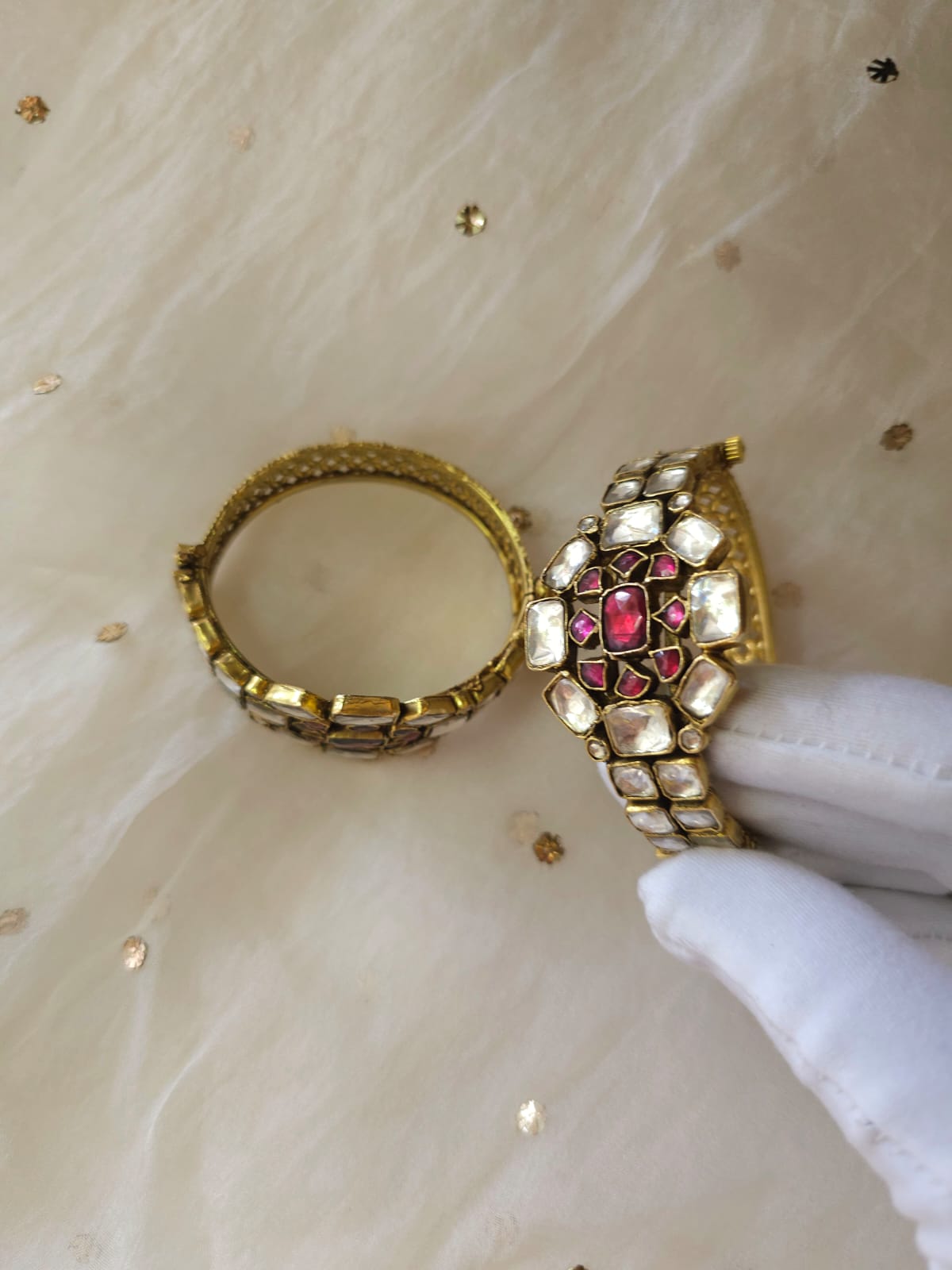 Gulkand bangle in oval shape for better fitting, made with silver alloy and studded with stone polki and rhodolite stones. It comes with a screw so that it can fit well. Please note the price mentioned is for one bangle.