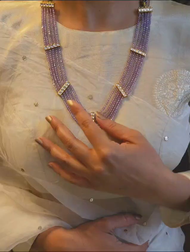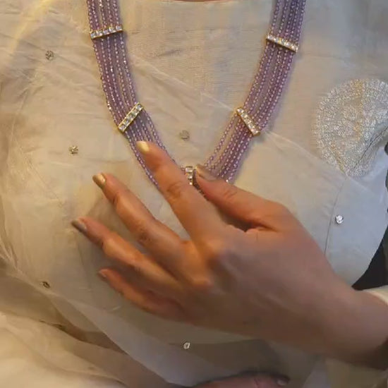 Jaamuni kantha necklace with five lines of high quality Swarovski crystal beads in purple color, which are attached to silver alloy pieces studded with stone polki to the string closer. It is a flexible necklace which can be worn like a round neck or a long necklace.