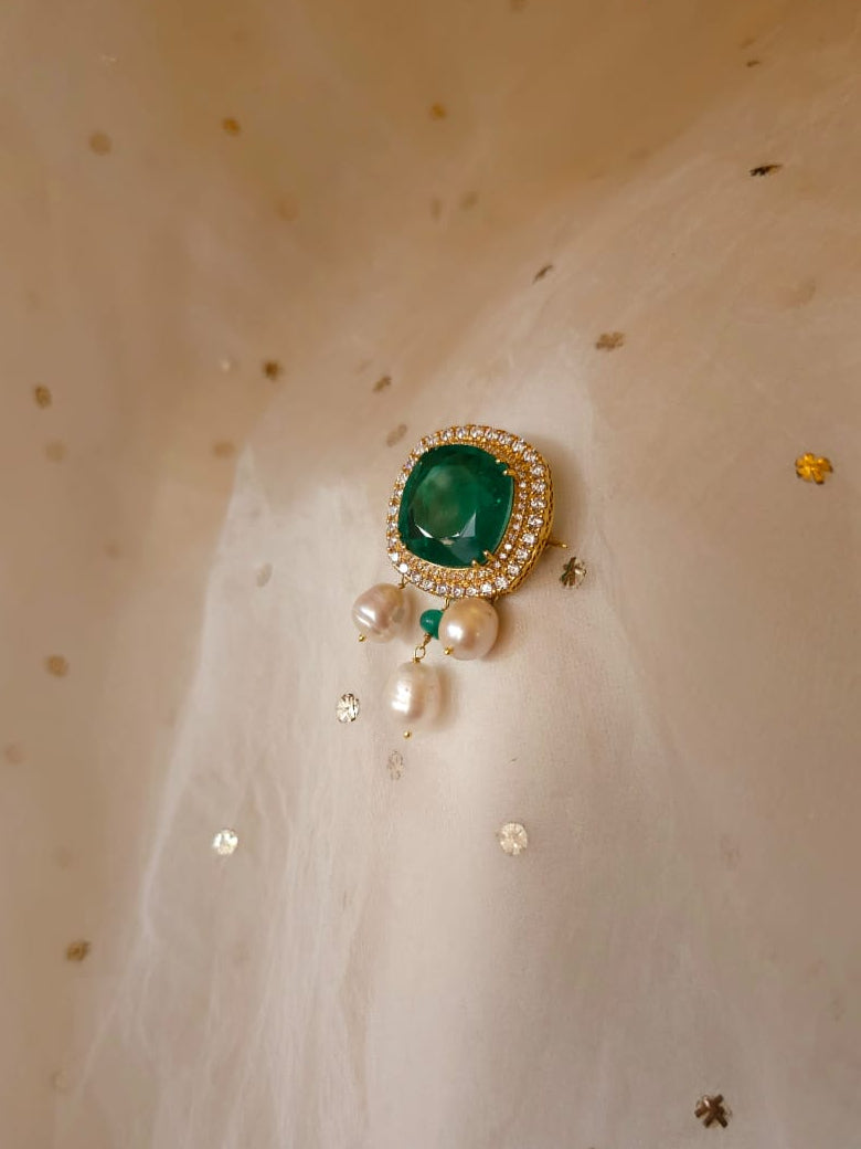 Jayapura gold plated brooch made with 92.5 silver. It is studded with green doublet stone and zirconia diamonds and adorned with fresh water pearls and green onyx. It comes with a brooch pin at the back. Length with pearls: 2 inches, width: 1.5 inches. This brooch can also be worn as a hair pin.