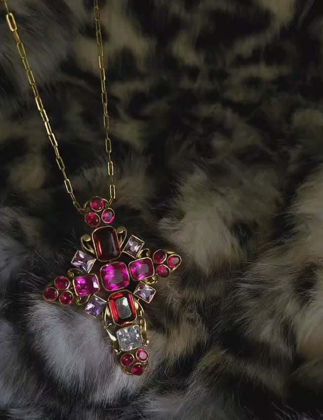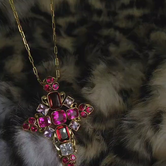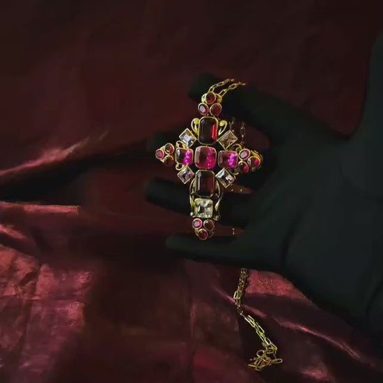 Karmel cross gold plated unisex brooch pendant made with 92.5 silver. It is studded with finest quality crystal stones in the shades of red and pink. The pendant comes with a brooch pin at the back, thus can be worn as a brooch or a pendant. It has a paper clip chain length 25 inches. Pendant height: 3.3 inches, width: 2.4 inches.