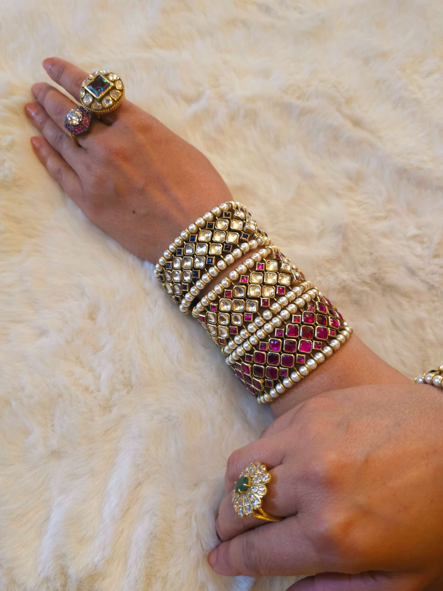 Miraval gold plated flexible bracelet made with silver alloy and studded with rhodolite stones and red stones. It is adorned with off white shell pearls. Please note the price mentioned is for one bracelet.