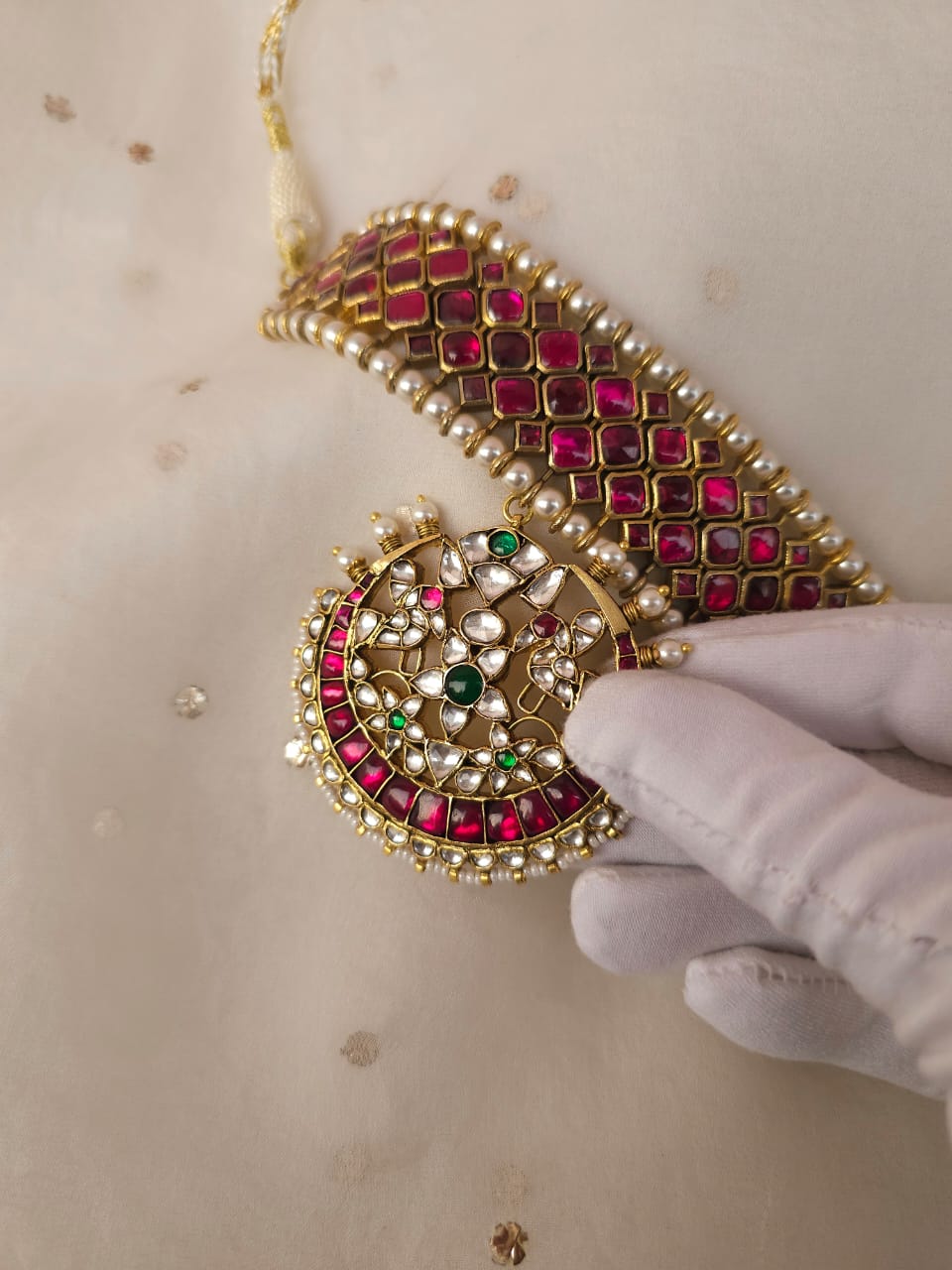 Miraval gold plated chand choker necklace made with silver alloy and studded with stone polki, rhodolite stones and red-green stones. It is adorned with faux pearls.