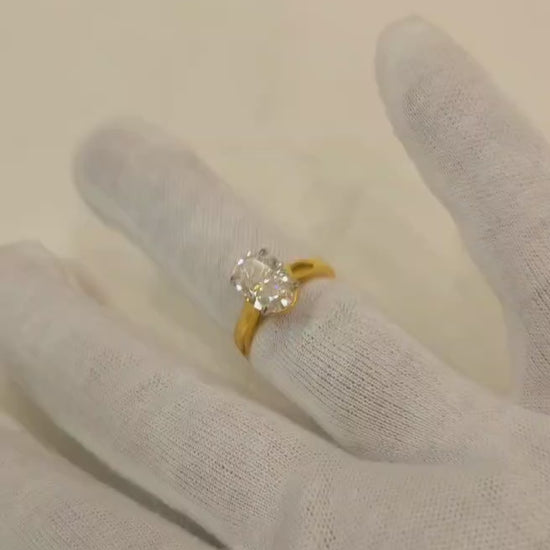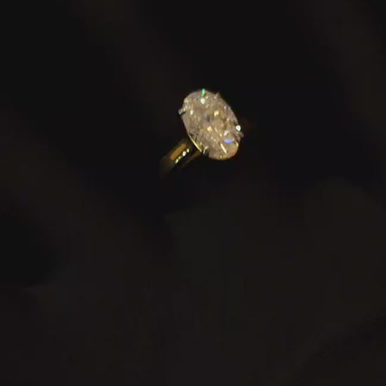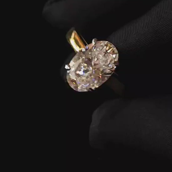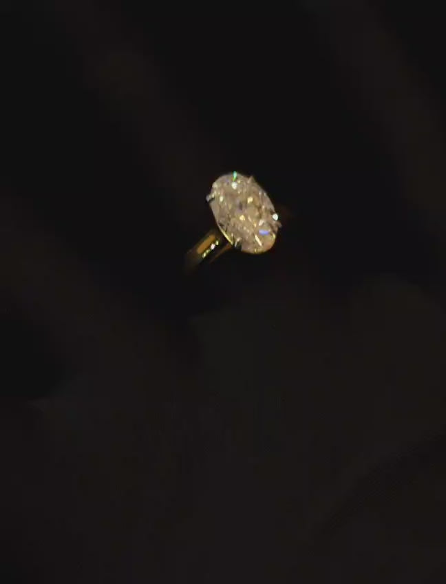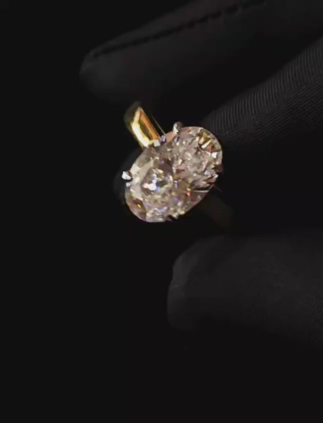 3.75 carat oval shape Moissanite diamond gold plated ring with 3.75 carat GRA certified moissanite diamond in excellent cut, D color and VVSI clarity. It is made with 92.5 silver and studded with 3.75 carat moissanite diamond. It comes with a GRA certificate.