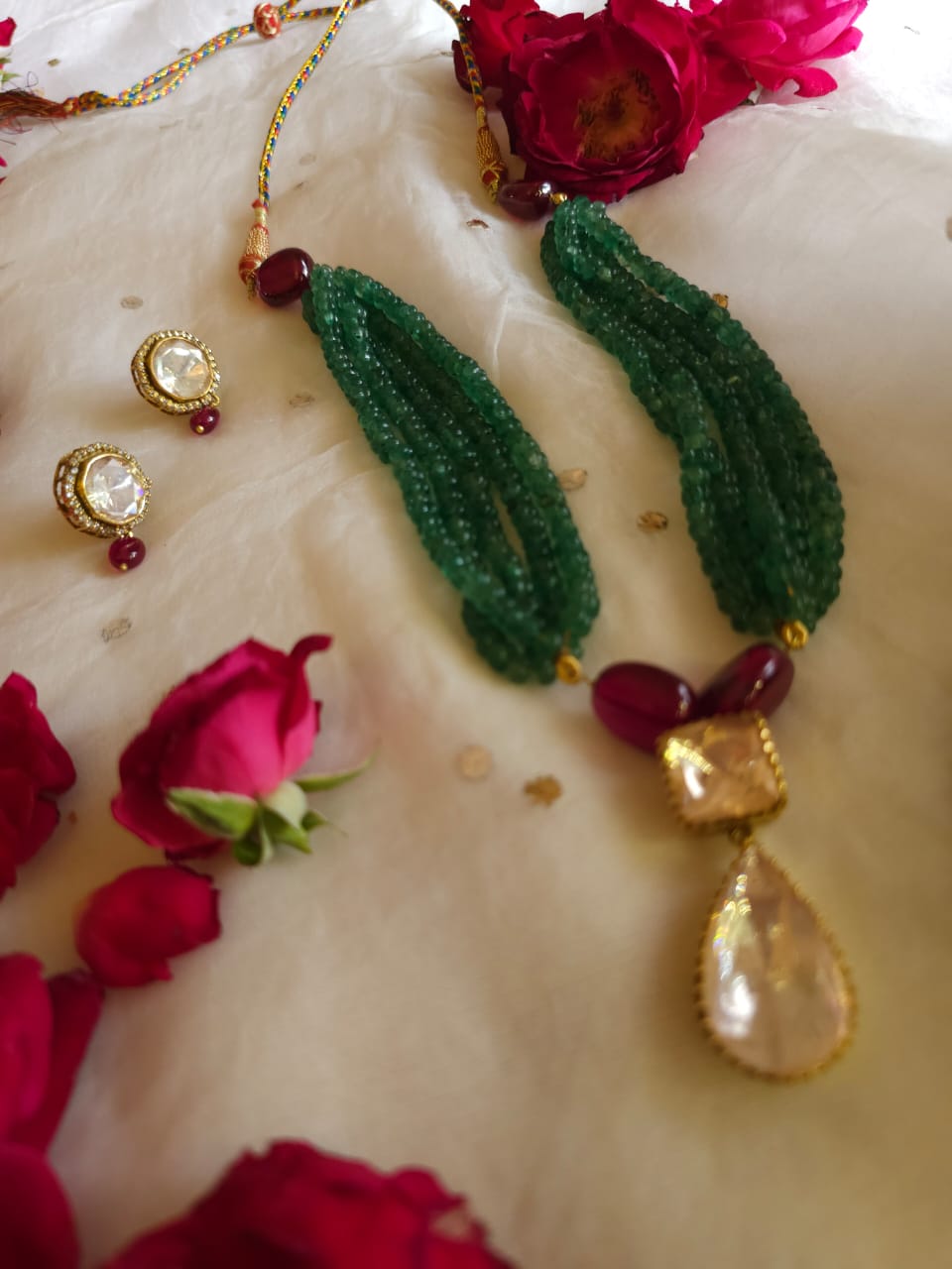 Pear moissanite gold plated gem necklace set made with 92.5 silver and studded with moissanite polki. It is adorned with carved green strawberry beads and semi spinel beads. With earrings.