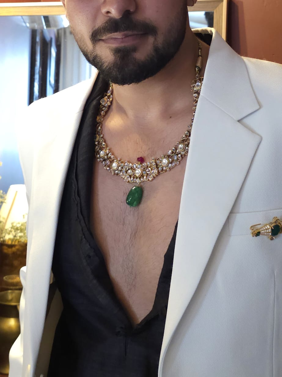 Pepper queen gold plated beryl necklace made with silver alloy and studded with antique stone polki. It is adorned with green beryl tumble bead and round semi-spinel bead.