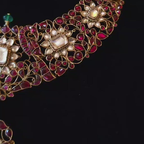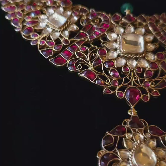 Pride of 19th century silver necklace made with 92.5 silver and studded with rhodolite stones and stone polki. It is adorned with green onyx bead. The necklace is inspired by a royal necklace which is displayed in the National museum of history in New Delhi. Very elegantly carved and shaped that is totally handmade and takes 15 days to get ready. The delicate curves of flowers and petals has been done so consciously to create the same aura of the original necklace from the museum. This is the star. Please Note: The pictures are clicked in 100% natural light, no fancy lights are used.