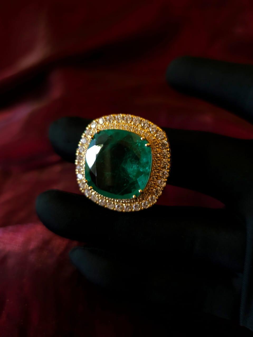 Radu gold plated brooch made with 92.5 silver. It is studded with green doublet stone and zirconia diamonds. It comes with a brooch pin at the back. Height: 1.2 inches, width: 1.2 inches. The design is inspired with an antique brooch from the royal jewels collection.
