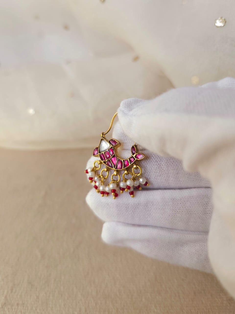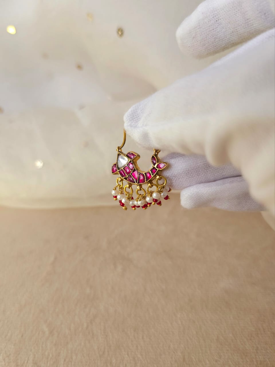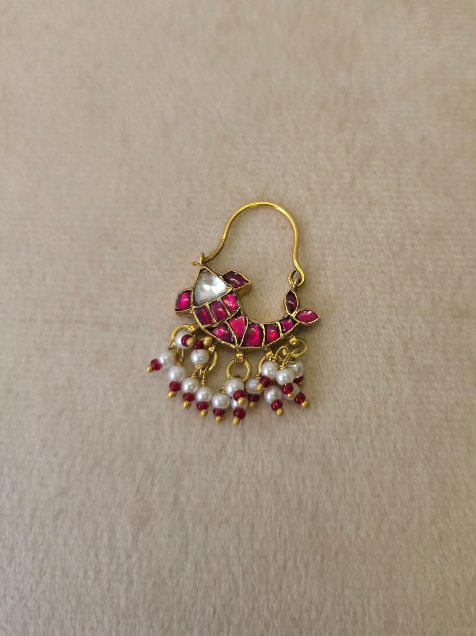 Red shafri piercing nath made with silver alloy and studded with stone polki and red stones. It is adorned with faux pearls.