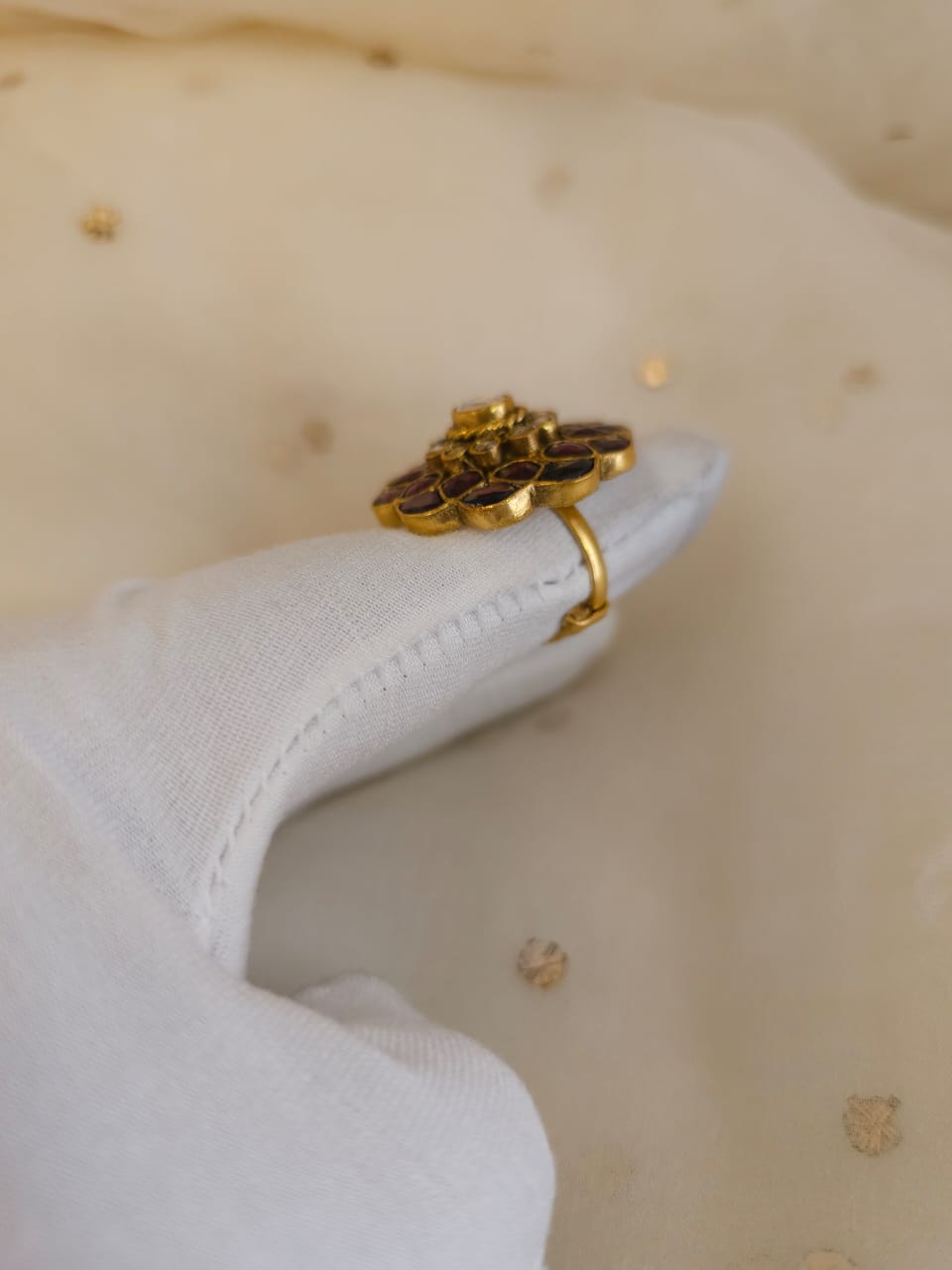 Rhodolite gulkand gold plated ring made with silver alloy and studded with stone polki and rhodolite stones. Top size: 1.1 inches. It has an adjustable band.