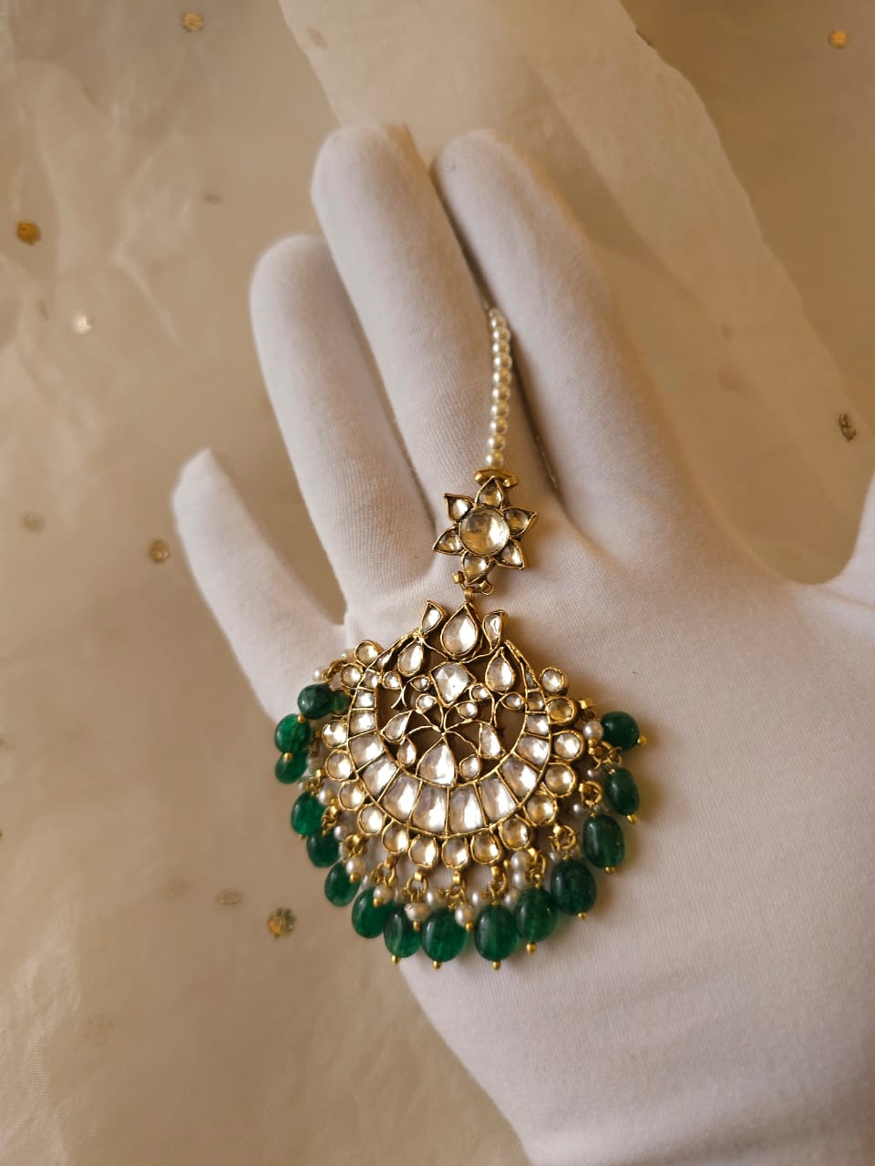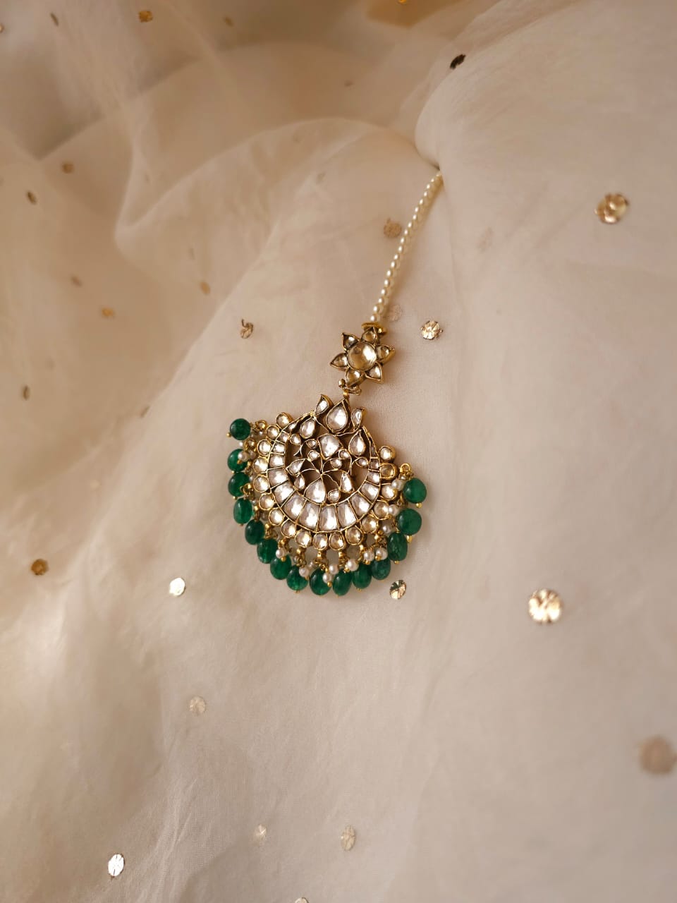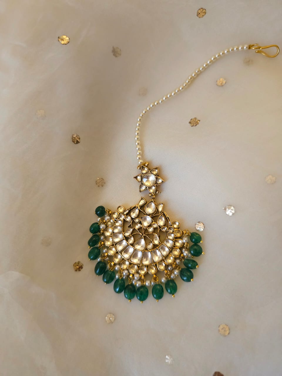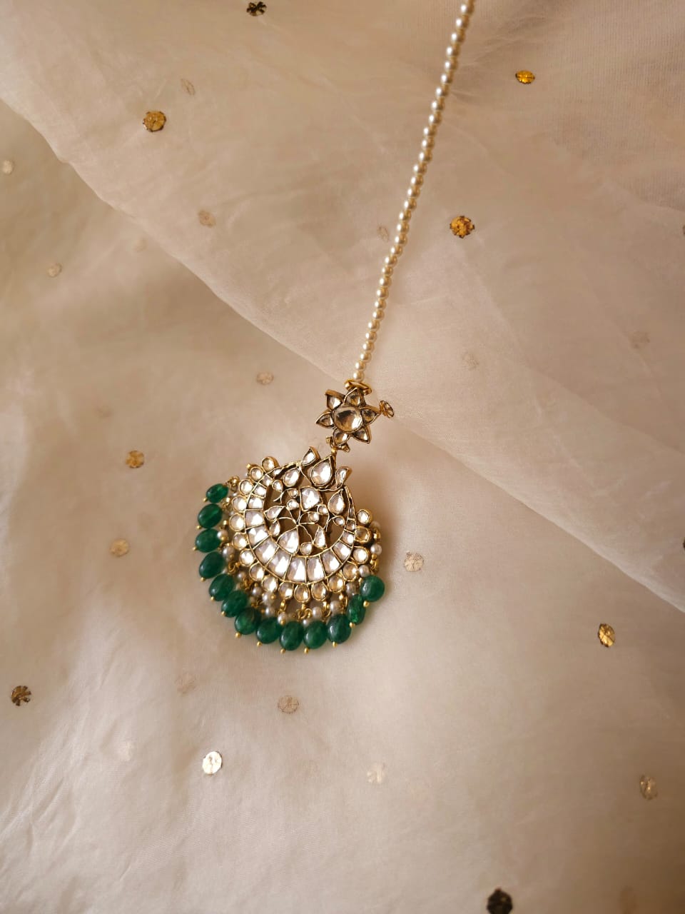 Sawai gold plated chandtika made with sliver alloy and studded with stone polki. It is adorned with green strawberry beads and faux pearls. Size is 2 inches.