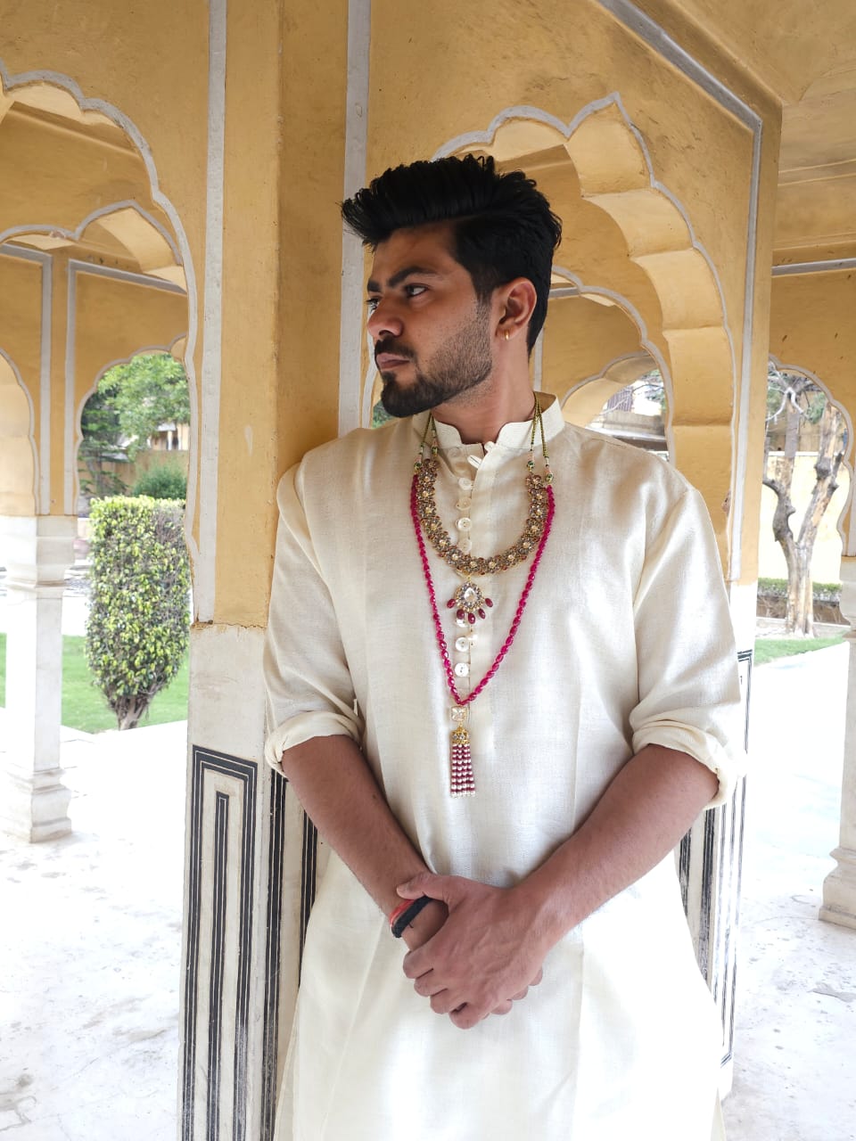Shy Di gold plated ruby necklace made with silver alloy and studded with antique stone polki and rhodolite stones. It is adorned with natural ruby beads and fresh water natural pearl.