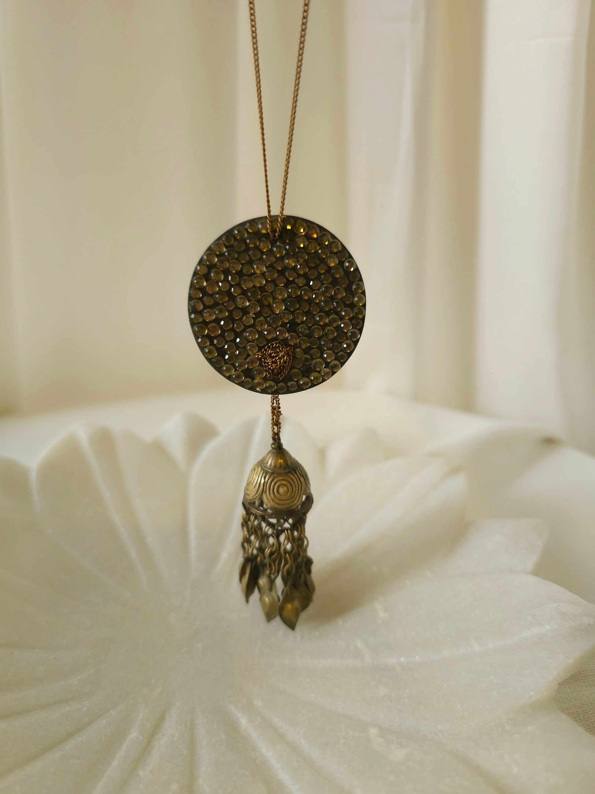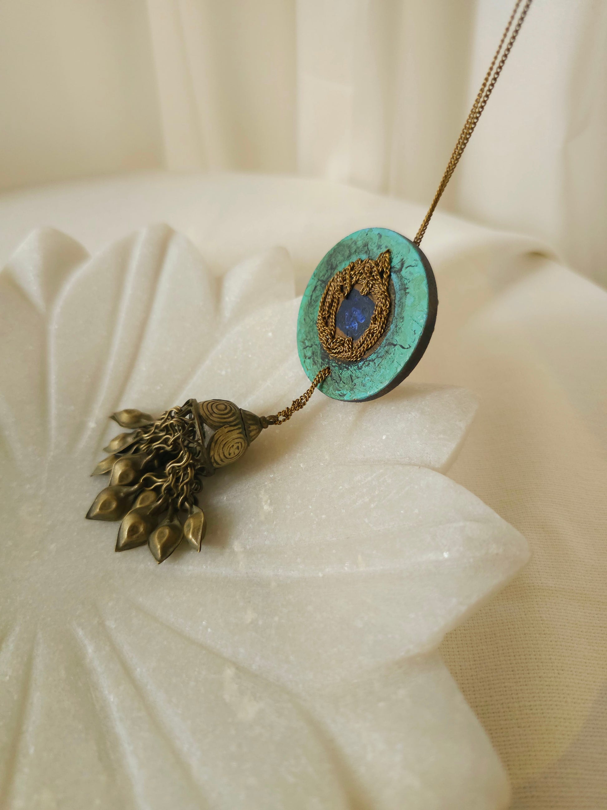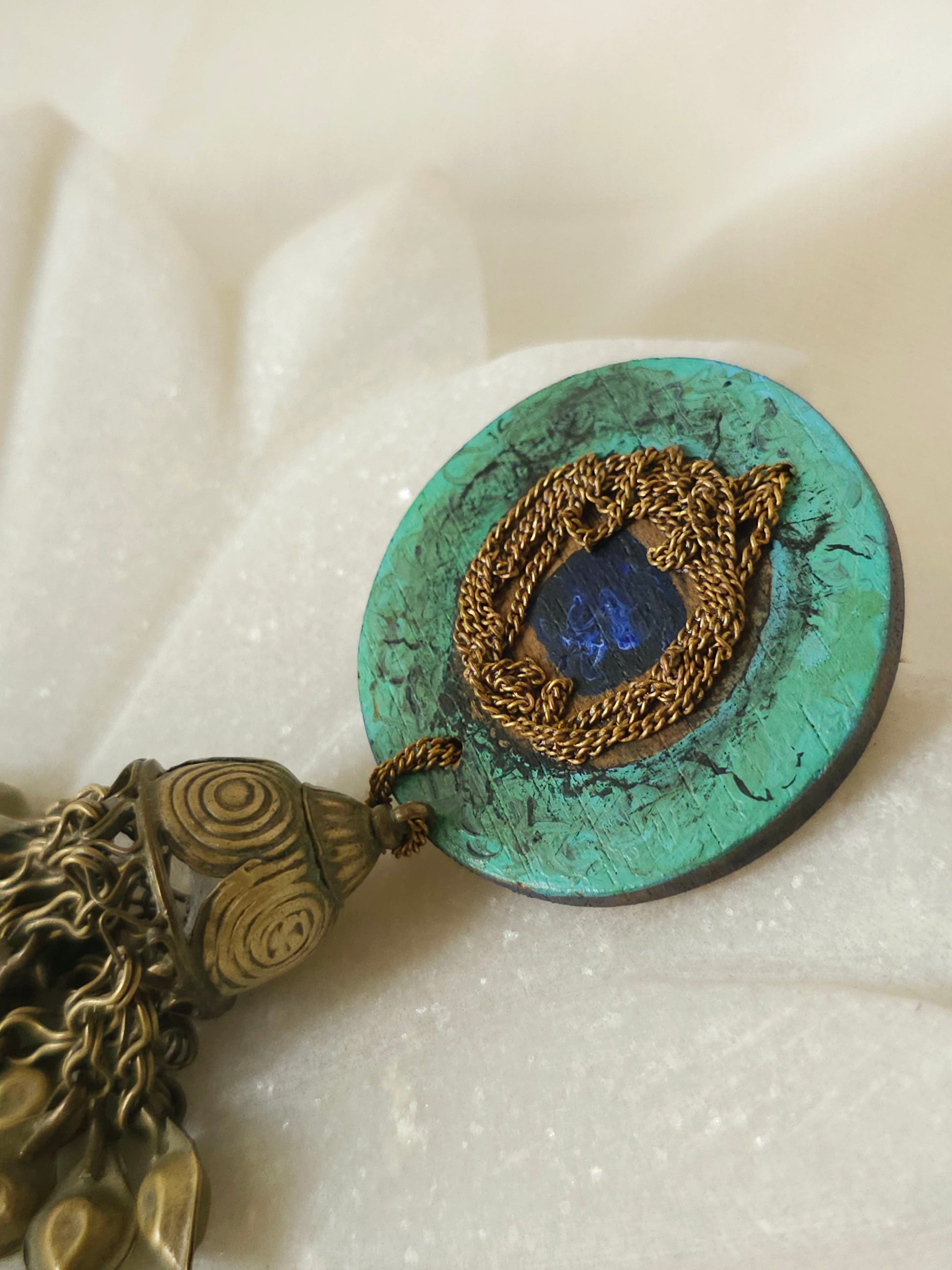 The mint rusty wooden hand painted round pendant necklace from the collection of "SOL" by "Rachna Goyal". It's a reversible pendant. From the back side it is adorned with moss green crystal stones. Designed with antique jhumka and chains which are made of brass.