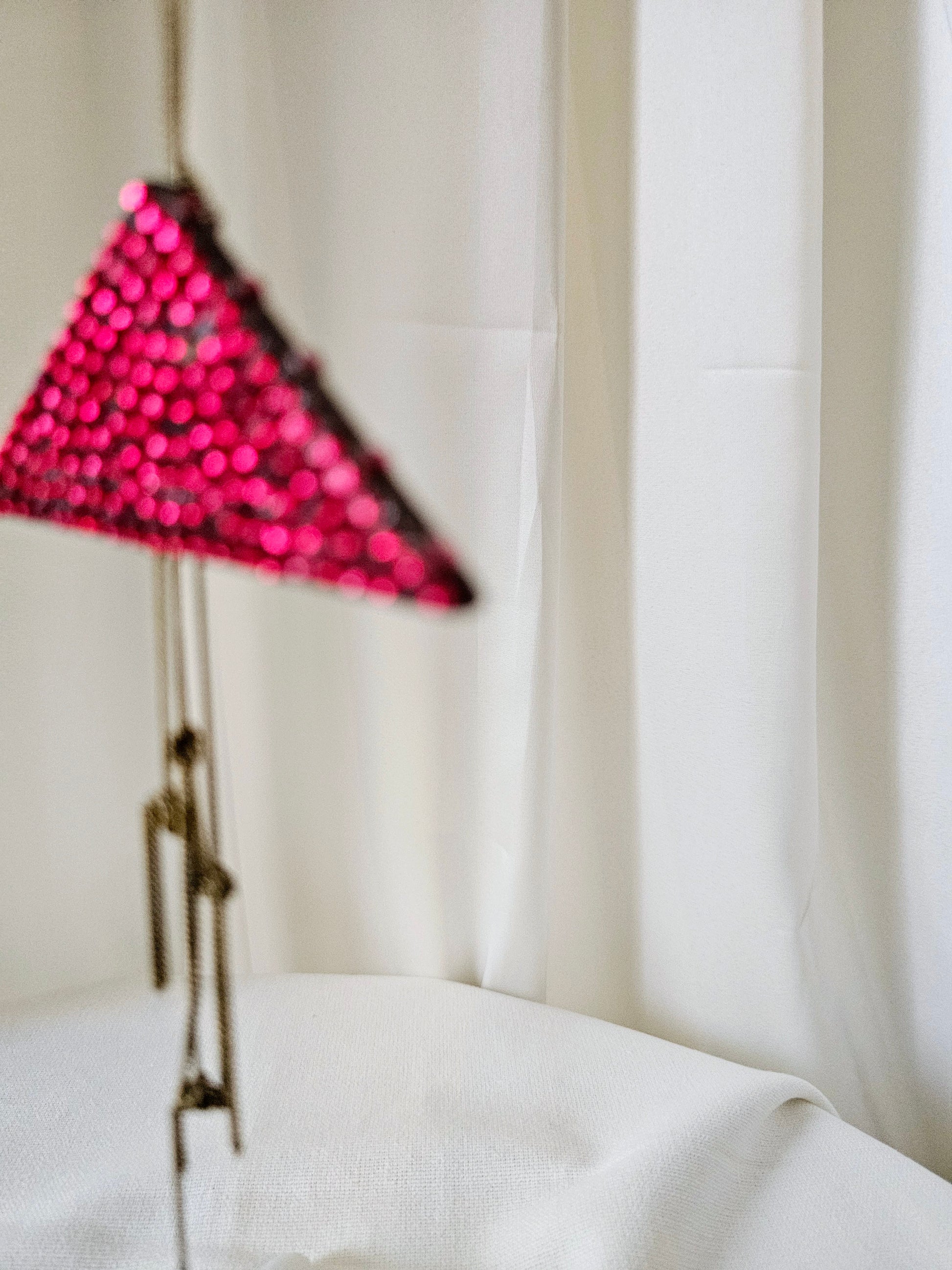 The mint rusty wooden hand painted triangle unisex pendant necklace from the collection of "SOL" by "Rachna Goyal". It's a reversible pendant. From the back side it is adorned with red crystal stones. The chains are made of brass.