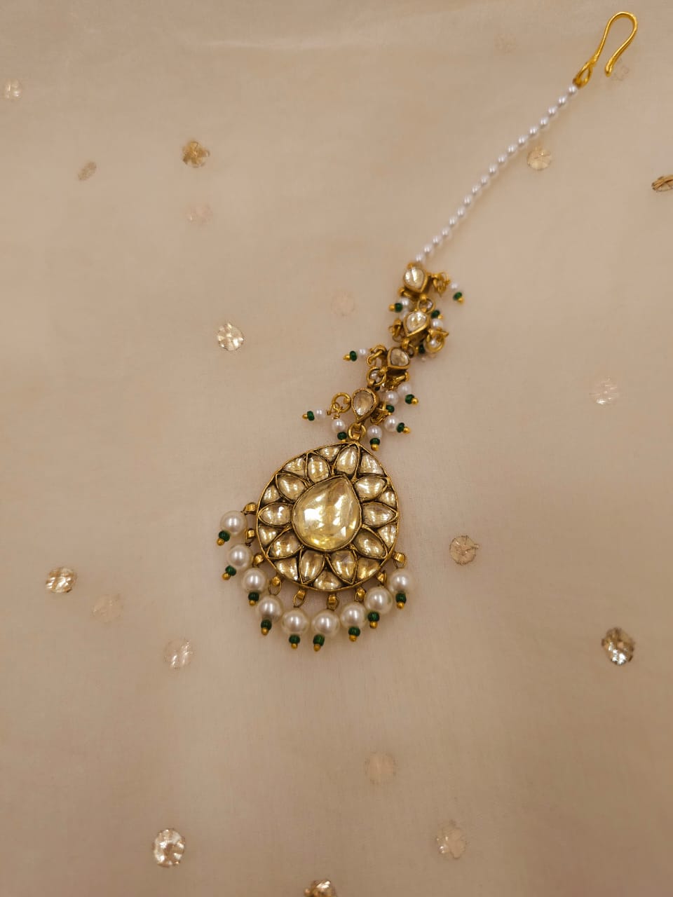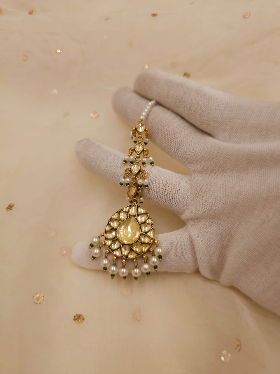 Suraj tal gold plated pear shape tika made with silver alloy and studded with yellow stone polki. It is adorned with faux pearls. Tika size is 1.1 inches.