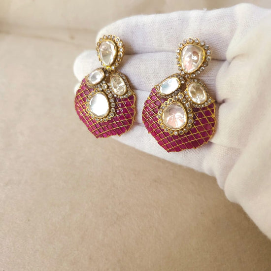The winter rose dwar gold plated 92.5 silver earrings studded with moissanite polki, red semi precious flat stones, and zirconia diamonds. This is from my exclusively designed jewellery collection "The City Palace Jaipur". These are Limited Edition earrings. All original pictures, no filters are used. Length - 2.3 inches.