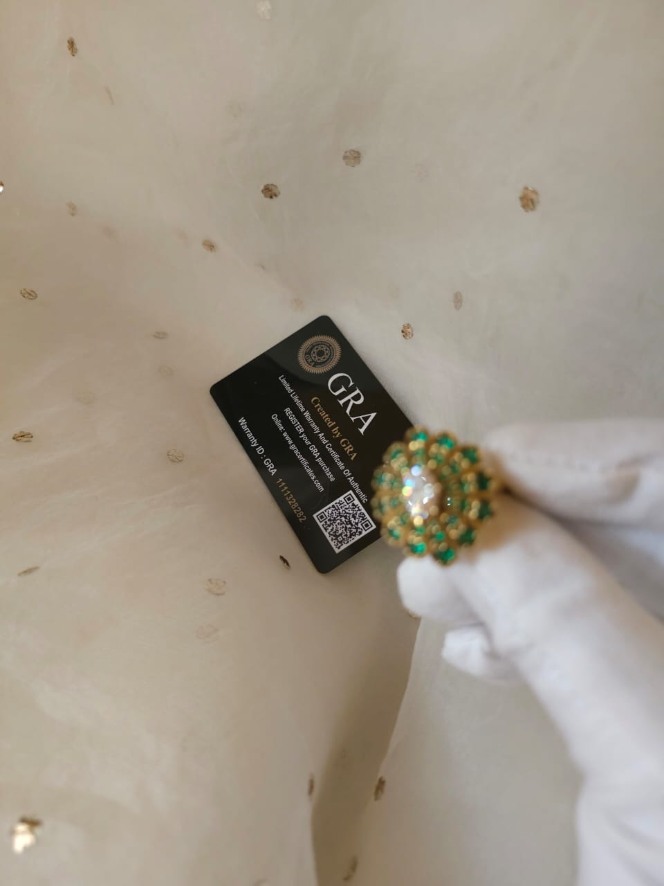 The crown feather antique gold plated moissanite ring made with 92.5 silver and adorned with 1.30 carat GRA certified moissanite diamond in excellent cut, D color and VVSI clarity. and crystal zirconia. The green color stone are zirconia diamonds. It comes with a GRA certificate.