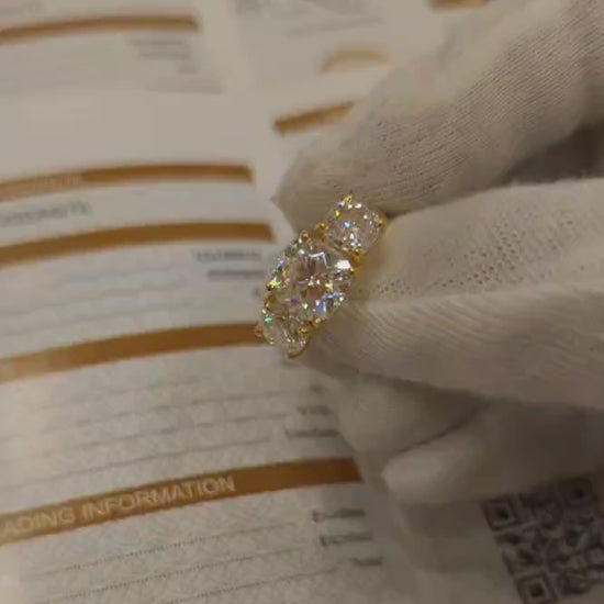 Three moissanite diamond gold plated ring studded with total 5 carat GRA certified moissanite diamonds in excellent cut, D color and VVSI clarity. It is made with 92.5 silver and studded with one 3 carat princess cut in the center and two at the both sides 1-1 carat princess cut moissanite diamonds. It comes with a GRA certificates.