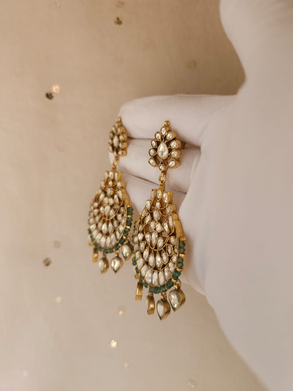 Tilottama gold plated chandbali earrings made with silver alloy and studded with stone polki. It is adorned with green aventurine beads. Length: 3.5 inches.