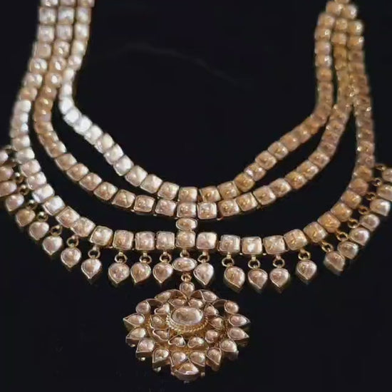 Tilottama gold plated silver necklace made with 92.5 silver and studded with stone polki. It has a string closer to adjust the length.