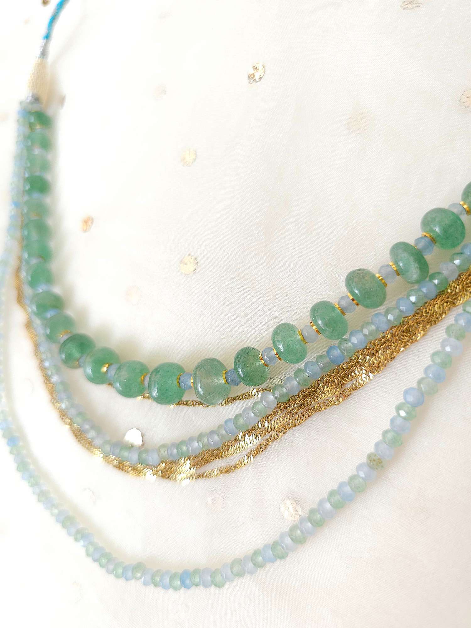 Udaisagar unisex chain necklace with three lines of green strawberry beads and light blue faceted agate beads and several lines of brass chains, which are attached to the string closer. It's handmade. The collection is inspired by all the venerated lakes of India which make these so pleasant and inherent with the shades of green, blue and pink.