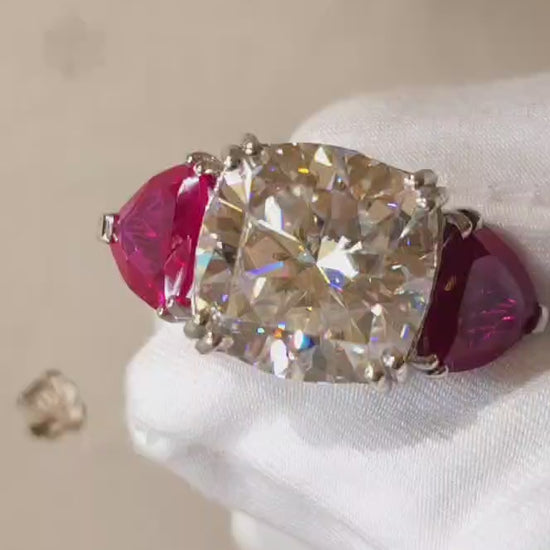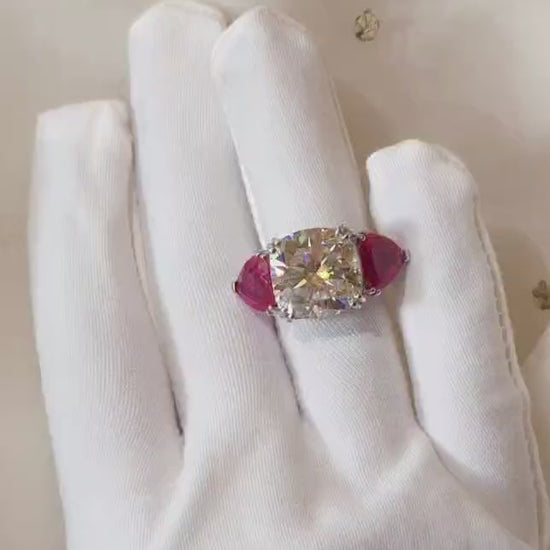 Whispering rose rhodium plated Moissanite ring made with 92.5 silver and studded with 14.25 carat GRA certified moissanite diamond in excellent cut, D color and VVSI clarity and finest quality red stones. It comes with a GRA certificate.